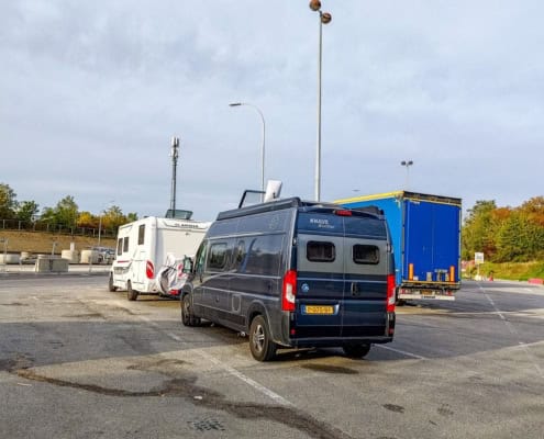 ReisOmdat de camperplaats waar we heen wilden gaan vol was staan we vanavond tussen de vrachtwagens langs de snelweg. Niet ideaal maar de plek waar we vandaan kwamen was ook alles behalve rustig dus maakt dit ook niet zoveel uit.