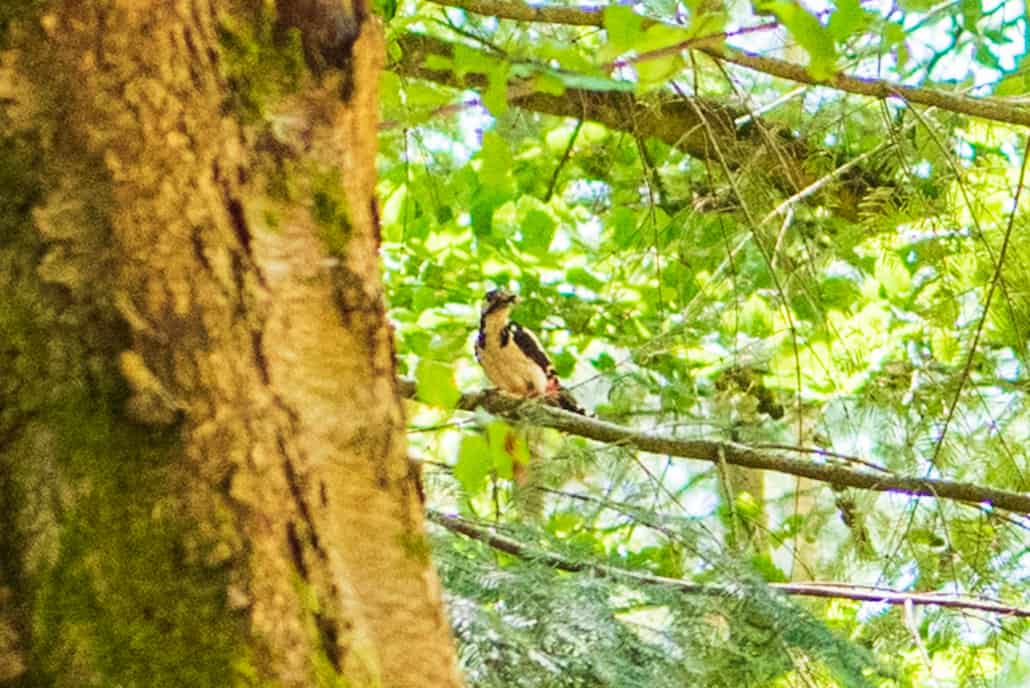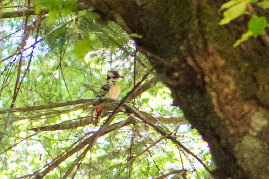 De jongen hebben we niet gezien, de twee ouders wel. Als we het goed hebben gezien waren het twee grote bonte spechten. Zoek hieronder mee. De foto’s zijn steeds meer vergroot. In de eerste serie moet je rechts van de boom kijken: