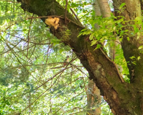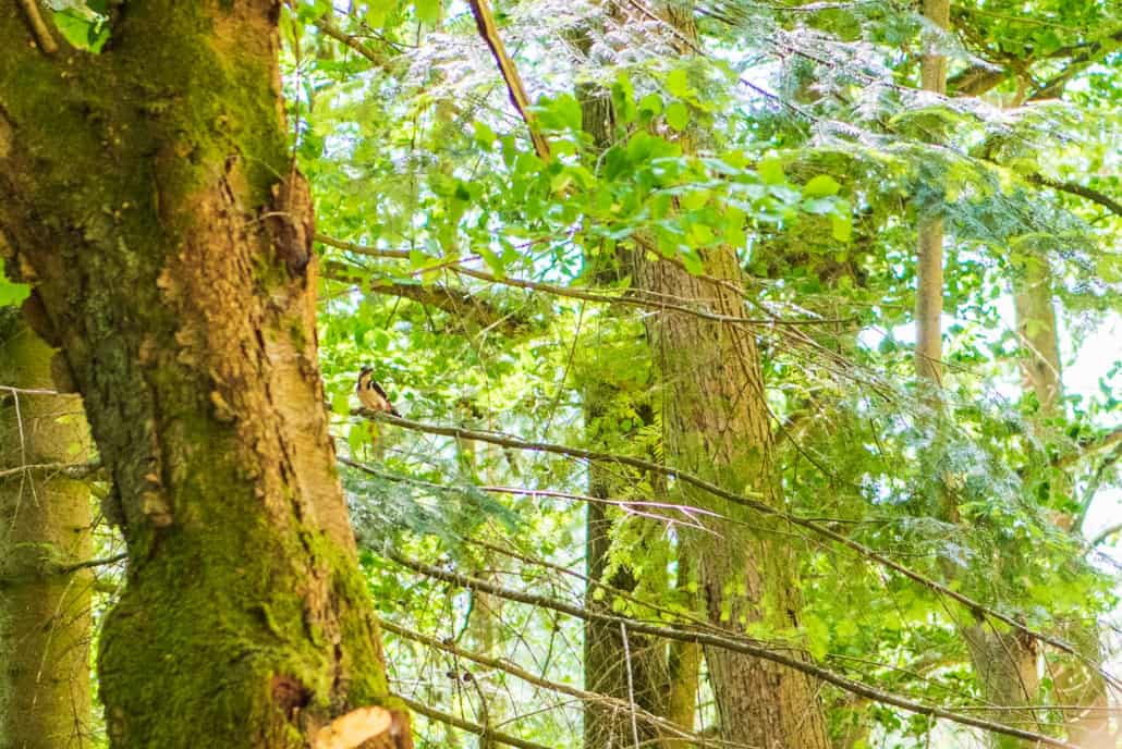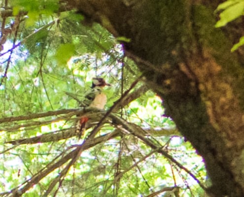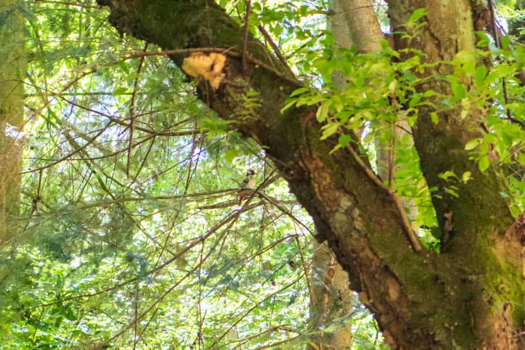 En die vogel kwam terug naar ‘zijn’ boom, waarvan wij vermoeden dat er ook een nestje met jongen zat. Goede foto’s heb ik niet kunnen maken met mijn ‘korte’ lens, maar wat hebben we toch weer kunnen genieten van dit moment. Met een verrekijker in stilte turen naar een vogel op een tak.