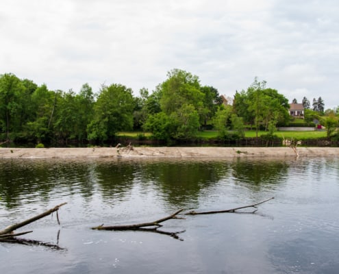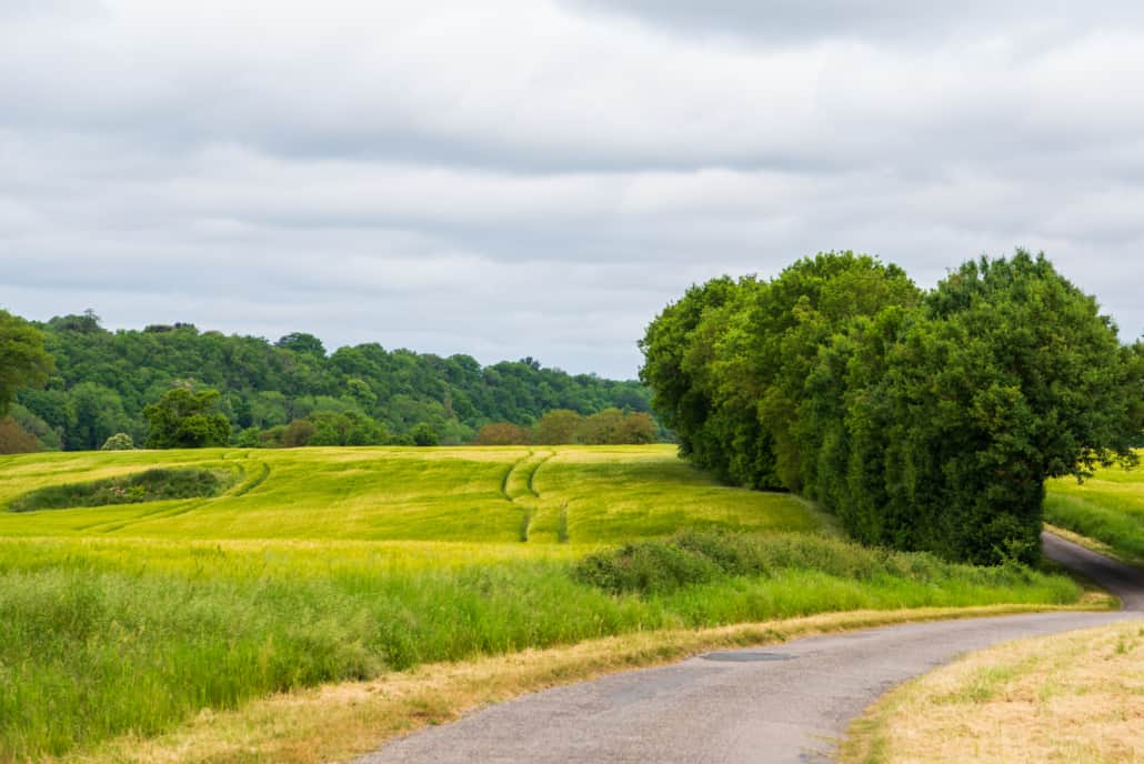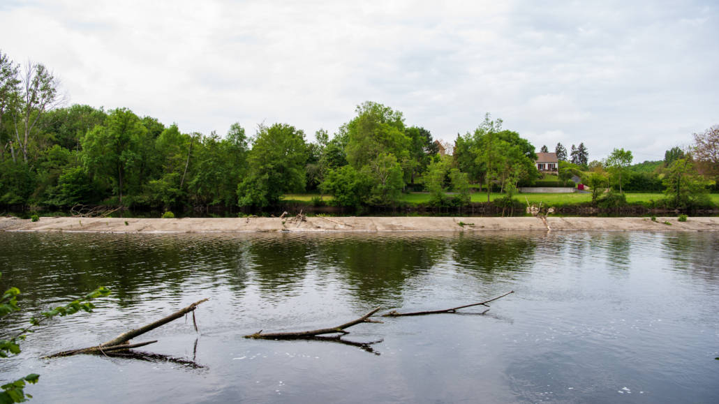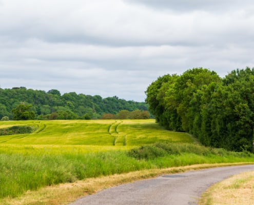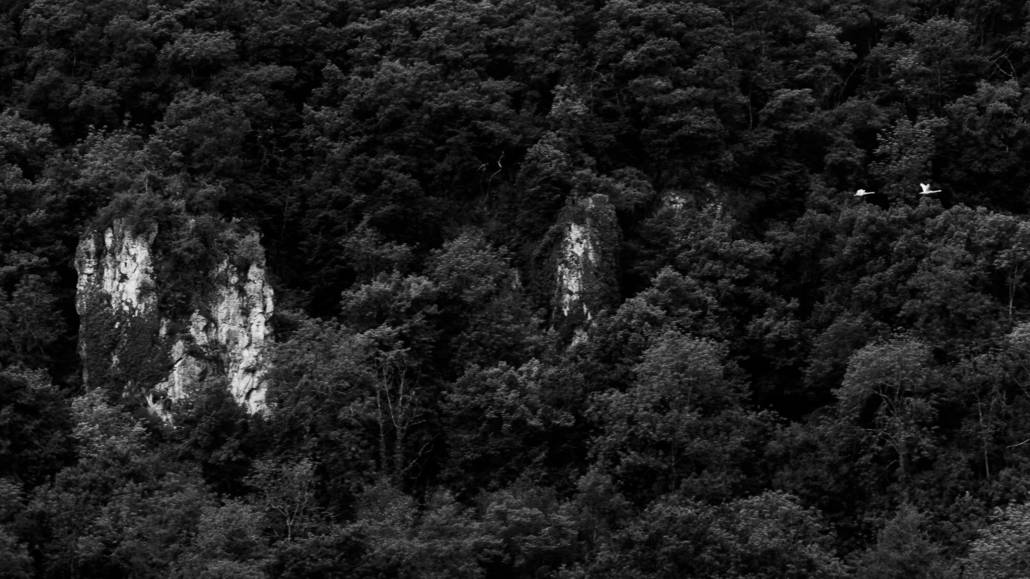 Op de andere route die we terugliepen, lag de weg een heel stuk hoger. Daardoor moesten we in het begin een flink stuk klimmen, maar hadden we ook meteen een mooier uitzicht over de heuvels en velden. Alleen dat al was mooier dan de tegenvallende waterval. En als kers op de taart zagen we zelfs 2 zwanen boven de rivier vliegen. Het was heel gaaf om te zien, maar tijd om van lenzen te wisselen was er niet. Op de foto dan ook het beste wat ik er zo snel – en op die afstand –  nog van kon maken.