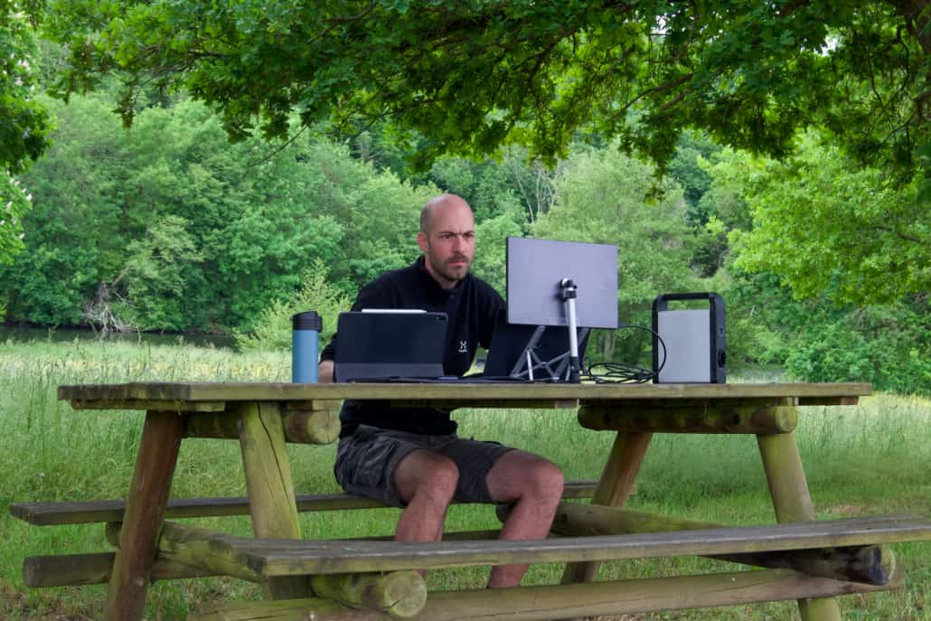 Zoals ook gisteren bedacht zou ik in de middag weer een paar uur ‘echt aan het werk’ gaan. Aan het bankje onder de bomen naast camperplaats. Heerlijk uit de zon en dus wat koeler dan in de camper zelf. Uit de zon zat ik daar ook zeker, maar echt zonnig was het dan ook niet. Toch pakte ik na de lunch mijn spullen bij elkaar en verhuisde ik naar het picknick bankje.