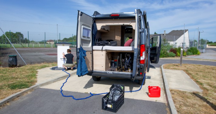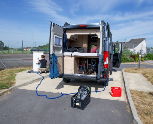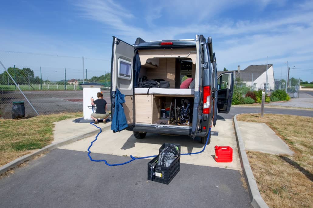 Ongeveer halverwege de route hadden we een serviceplek gevonden, waar we alles konden doen en die zou met munten werken. Het lag erg verstopt, maar bij aankomst zag alles er netjes uit, en het werkte! En wat nog beter uitkwam, we konden de munten gebruiken die we eerder bij de bakker hadden gekregen. We vulden deze keer dus zonder tegenslagen onze watertank en noodvoorraad aan voor we verder konden.