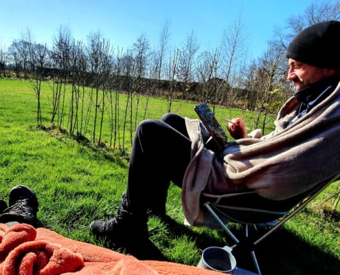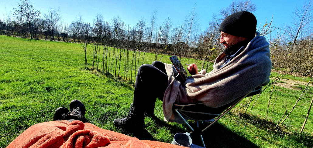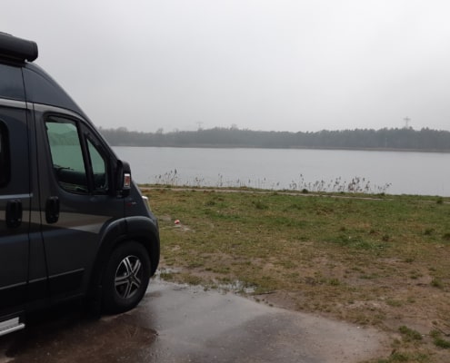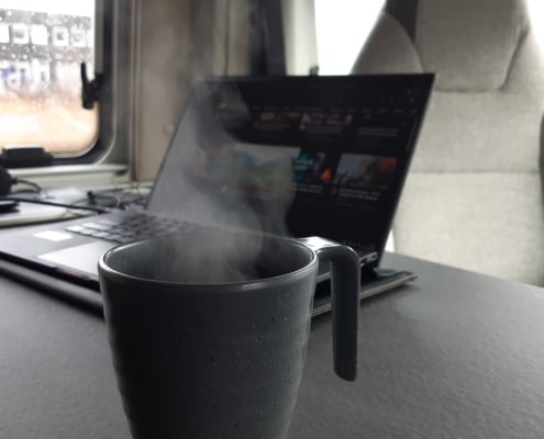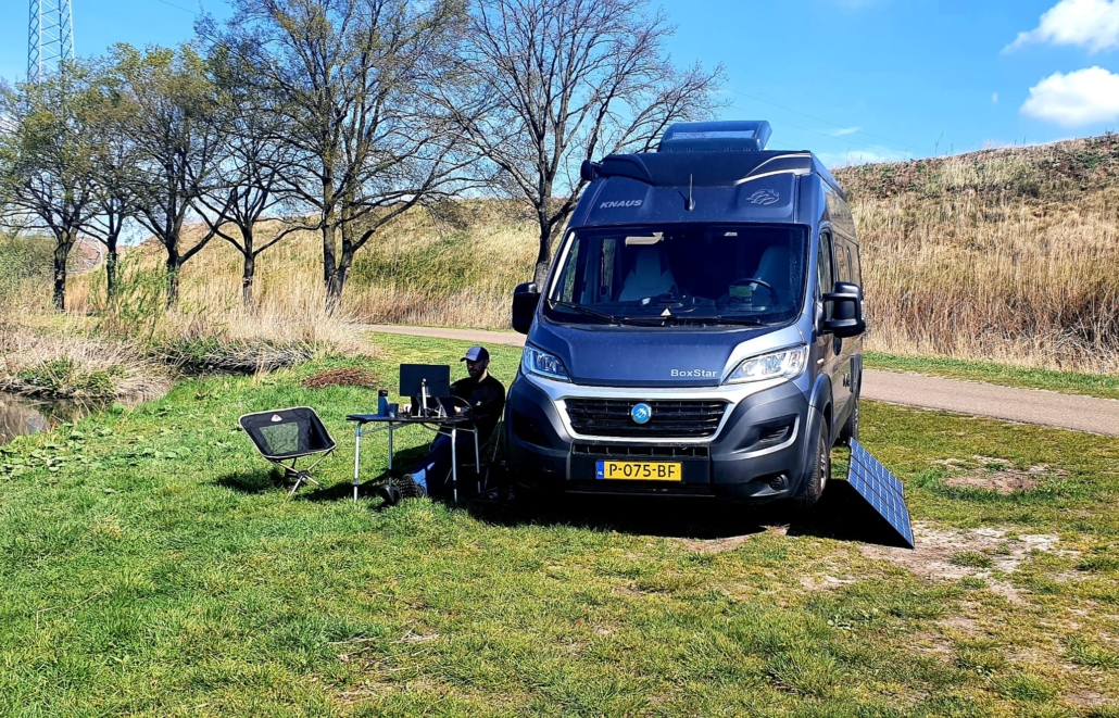 Een goede werkplek is misschien wel een van de belangrijkste ‘eisen’ om te kunnen camperen. Gelukkig was ik afgelopen jaren al heel erg ingericht op een mobiele werkplek, maar ook nu moest dit uiteraard weer even getest worden. Koffie zetten… check. Een bureau voor laptop, scherm, toetsenbord en muis… check. Internet… check. Weer of geen weer, inmiddels kan ik binnen en buiten praktisch overal werken als het nodig is.