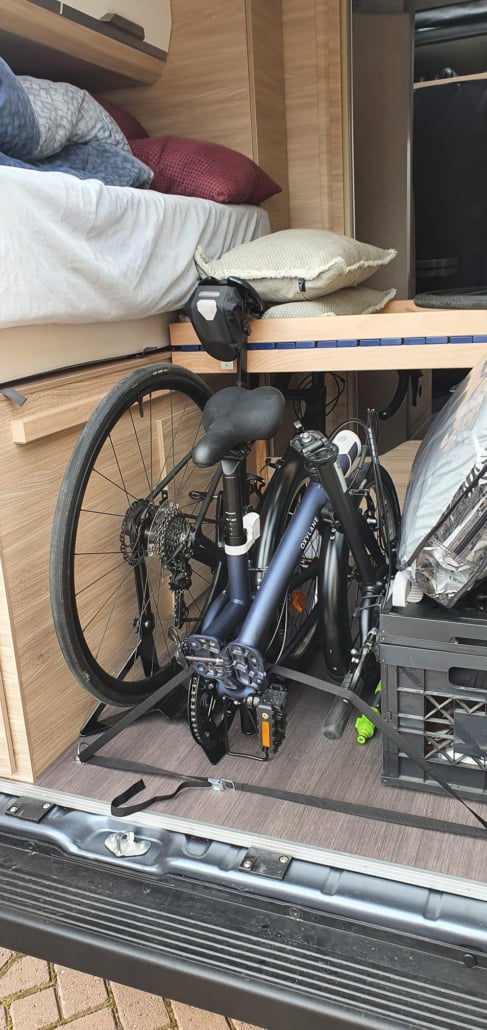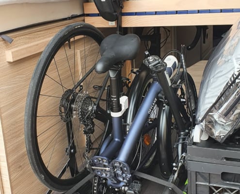 Onze vorige camper had een drager om onze elektrische scooter mee te nemen. Met een buscamper is dat, door de achterdeuren net wat ingewikkelder, waardoor we verschillende opties hebben overwogen. Een scooterdrager met onze scooter, een fietsendrager voor onze fietsen, de fietsen achterin. Uiteindelijk is het een optie geworden waarbij we 2 fietsen (opgevouwen) achterin de bus mee kunnen nemen. Zo blijven we flexibel om even een boodschap te doen zonder de camper te verplaatsen, en hebben we niet de extra lengte en het extra gewicht van de scooter (en drager) op de achteras erbij.