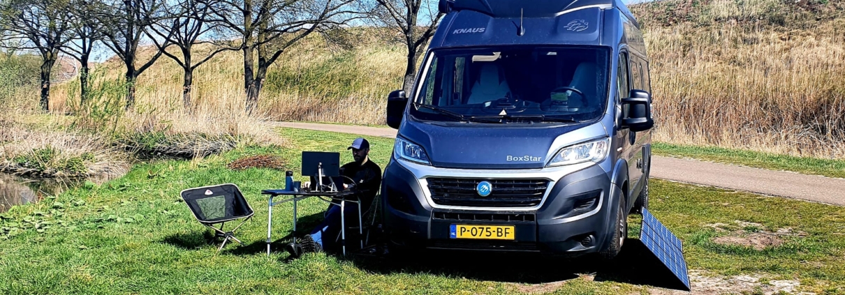 In deze nieuwe camper is alles weer proberen, testen en uitzoeken. Bijvoorbeeld hoe neem je alles mee, wat is de meest efficiënte en praktische indeling, hoe lang kunnen we zonder stroom en met ons water doen. Deze week een laatste test gedaan waarbij ik een volledige ( halve ) werkdag op de energie van de zonnepanelen heb kunnen doen. Ook lees je hier de andere ‘praktijktesten’ voor de woonaccu en indeling.