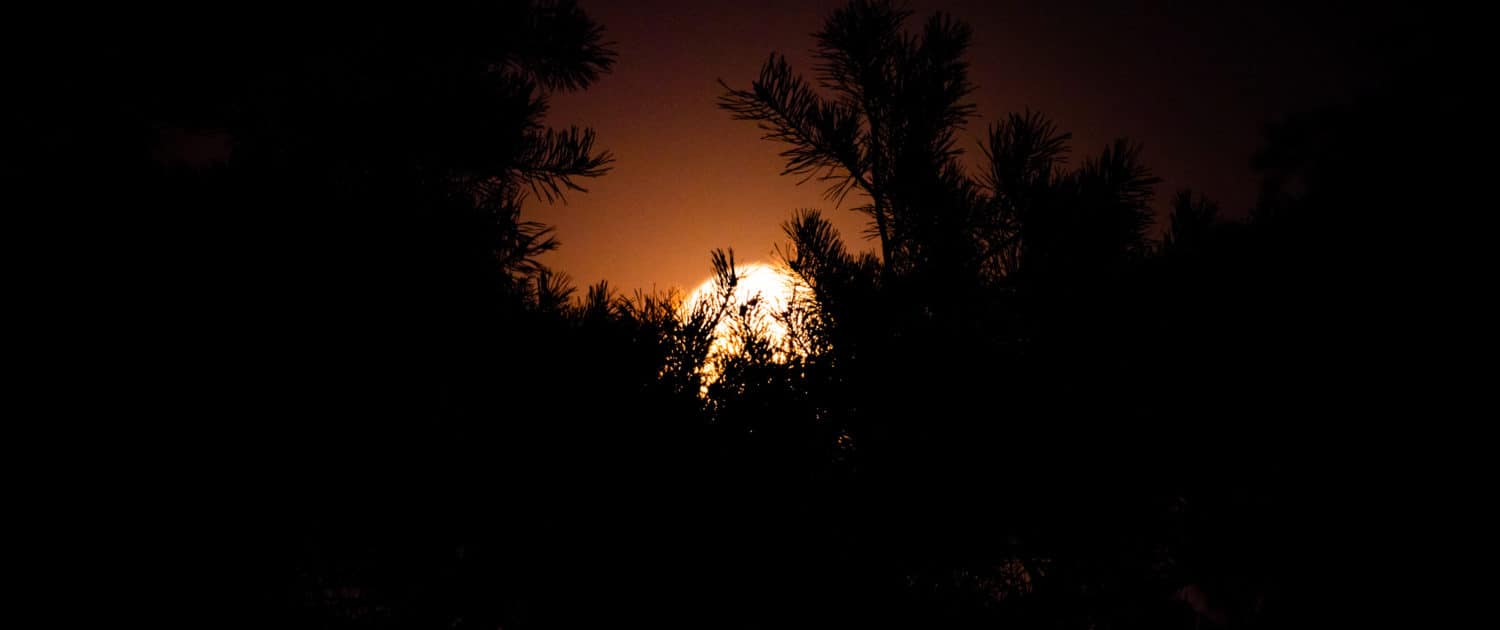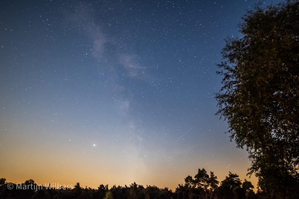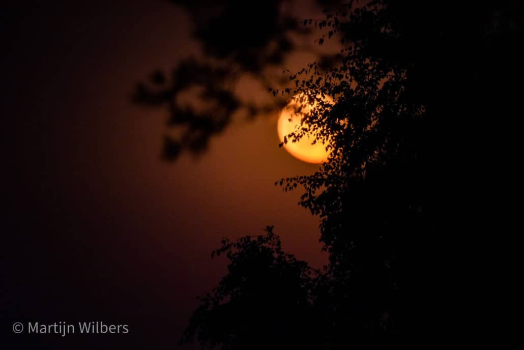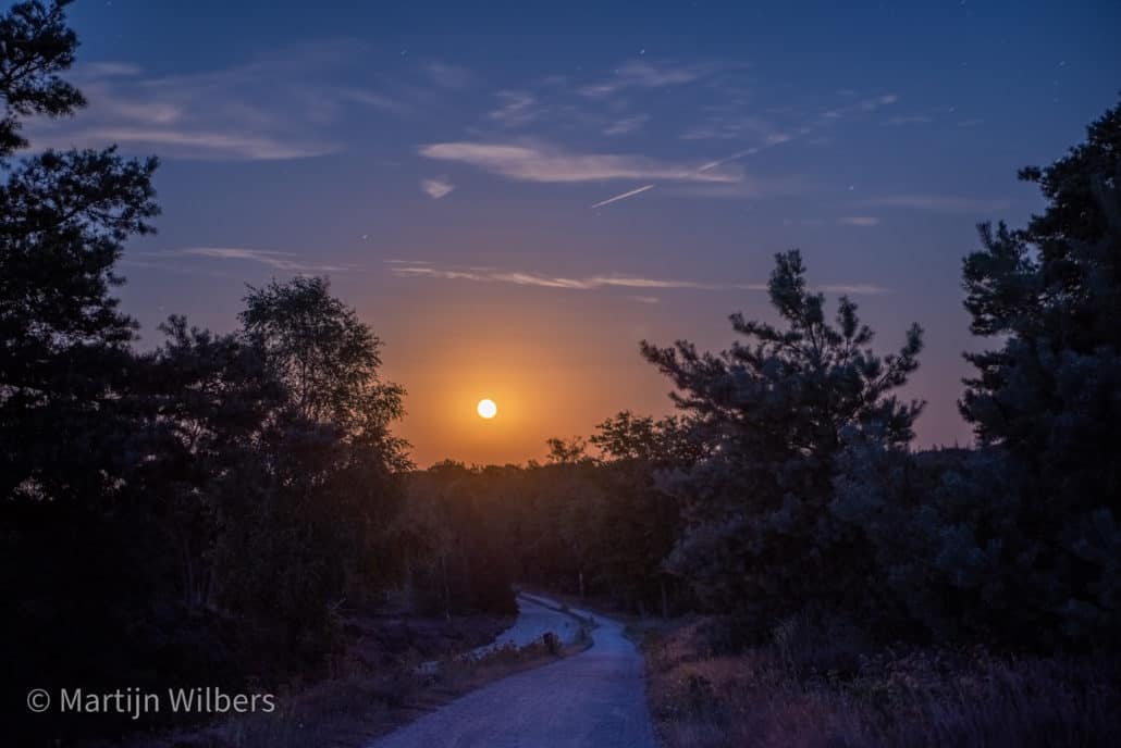 Na twee dagen zijn we allebei weer onze eigen weg verder gegaan en zijn wij een tussen de bomen beschutte plek gaan opzoeken. In de hoop dat de temperatuur in de camper niet al te hard zou oplopen. Om zelf niet de hele dag in de hitte te blijven, zijn we met de scooter gaan rijden door de Sallandse Heuvelrug, een mooi bosrijk gebied met wat stukken heide. Tijdens het stuk over de heide zag ik een mooie plek waar de sterren op de foto gezet konden worden. In de avond zijn we dan ook opnieuw terug gegaan naar die plek. Toen we daar aankwamen kwam de maan net op, een grote verlichte bol, met een hele oranje gloed er omheen. Ik heb een poging gedaan om het vast te leggen, maar dit is nauwelijks gelukt.