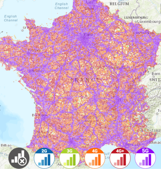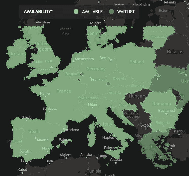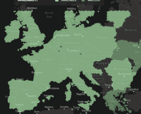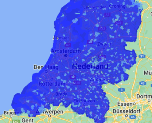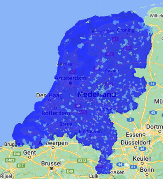 Ter vergelijking met de 4G dekkingskaarten is dit de dekkingskaart van Starlink: