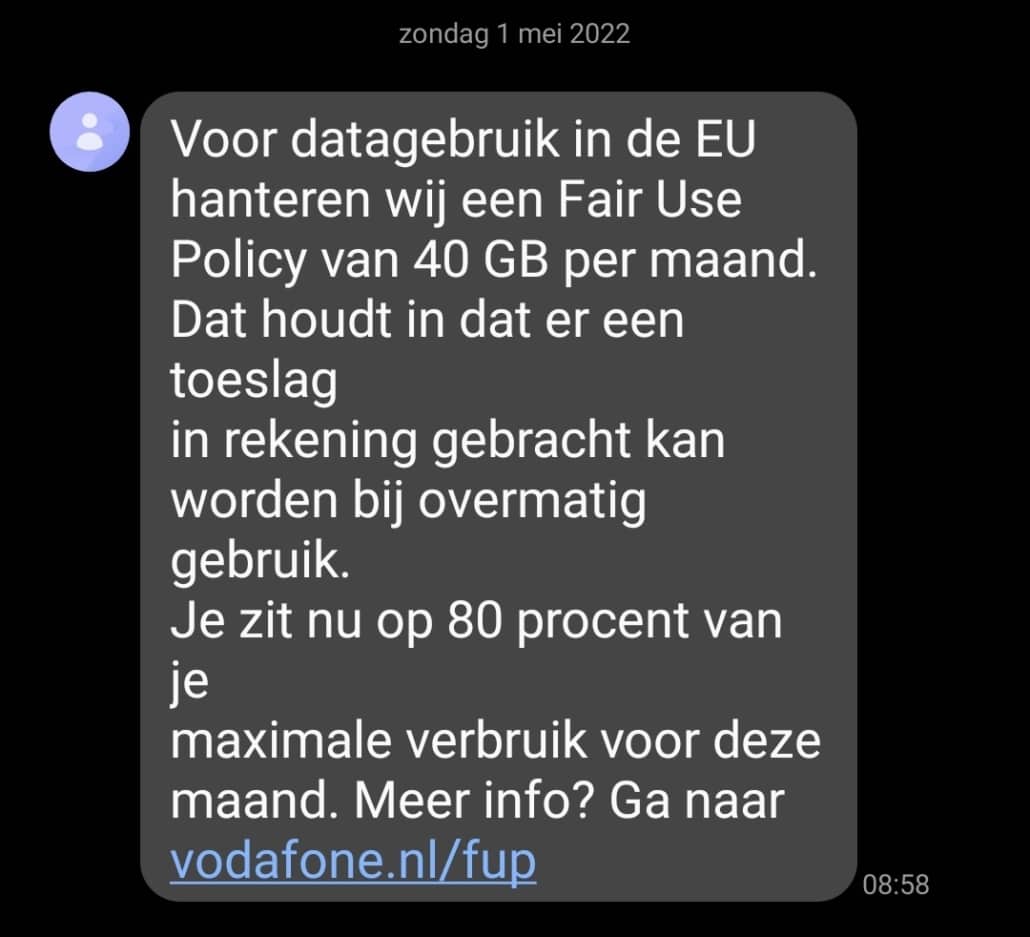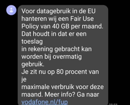 Zelf hebben wij een bundel van 100 GB aan internet, maar binnen 1 week na vertrek kregen we al een melding over het Fair Use Policy. Zo mogen we niet extreem veel meer in het buitenland gebruiken, dan dat we gemiddeld in de afgelopen 4 maanden in Nederland deden.