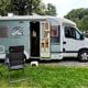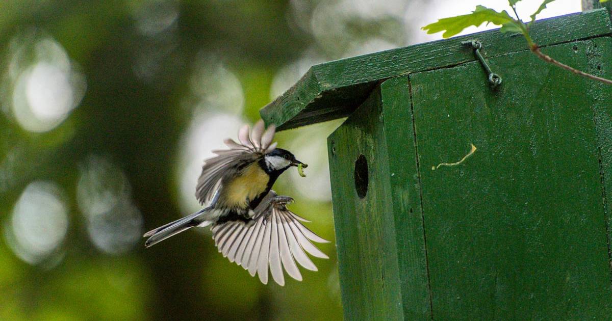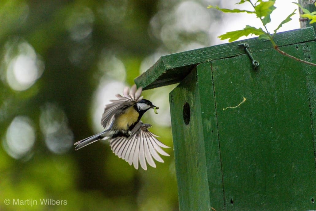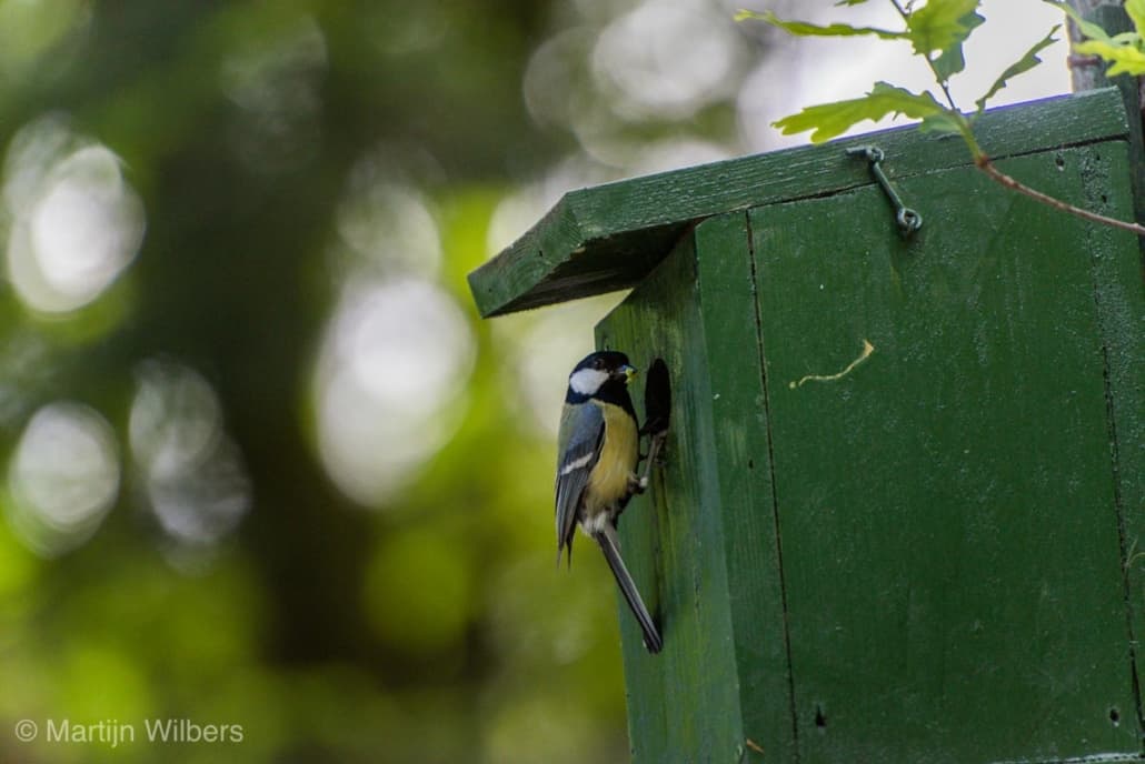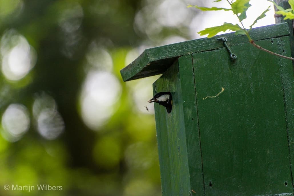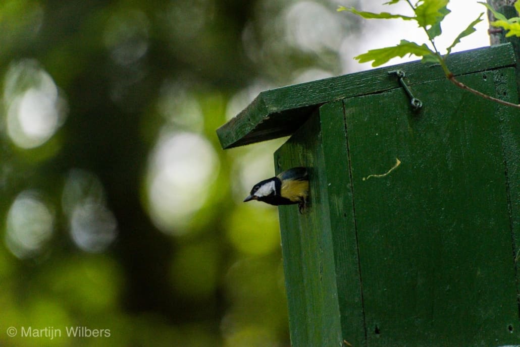 Naast onze camperplaats voor de komende dagen hangt een vogelhuisje met daarin een nestje van een koolmees. Beide ouders vliegen af en aan met eten voor (waarschijnlijk) hun jongen.
