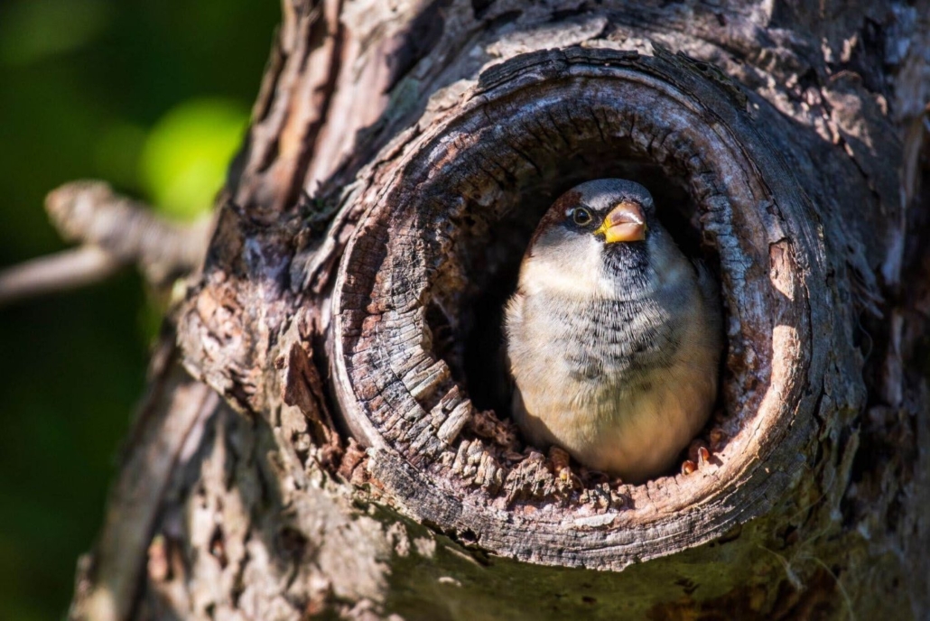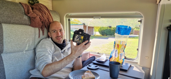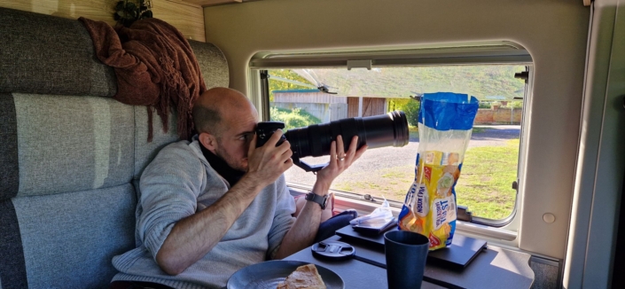 Nadat we onze camper hadden geleegd een plekje hadden gevonden en hadden betaald was het tijd voor lunch. We stonden naast een appelboom en ik zag ineens uit een holletje in de boom een vogeltje tevoorschijn komen. Martijn pakte zijn camera en kon vanuit het raam een mooie foto maken.