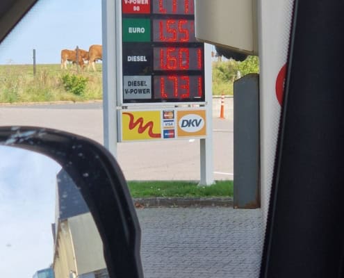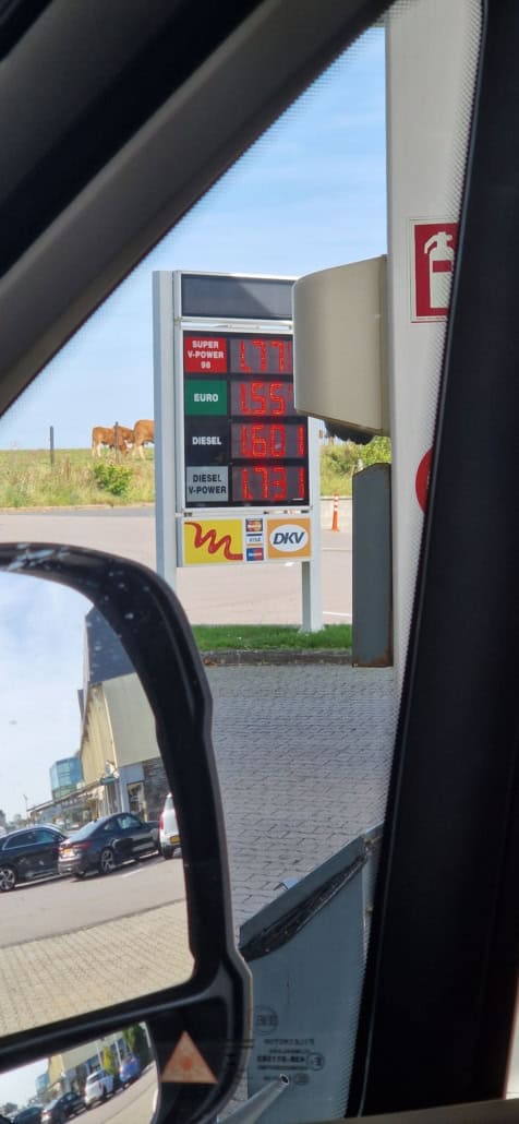 We zijn helemaal via Luxemburg naar het noorden gegaan en net voor de Belgische grens hebben we nog getankt want dat scheelt hier, zeker als je 65 liter moet tanken, best veel.